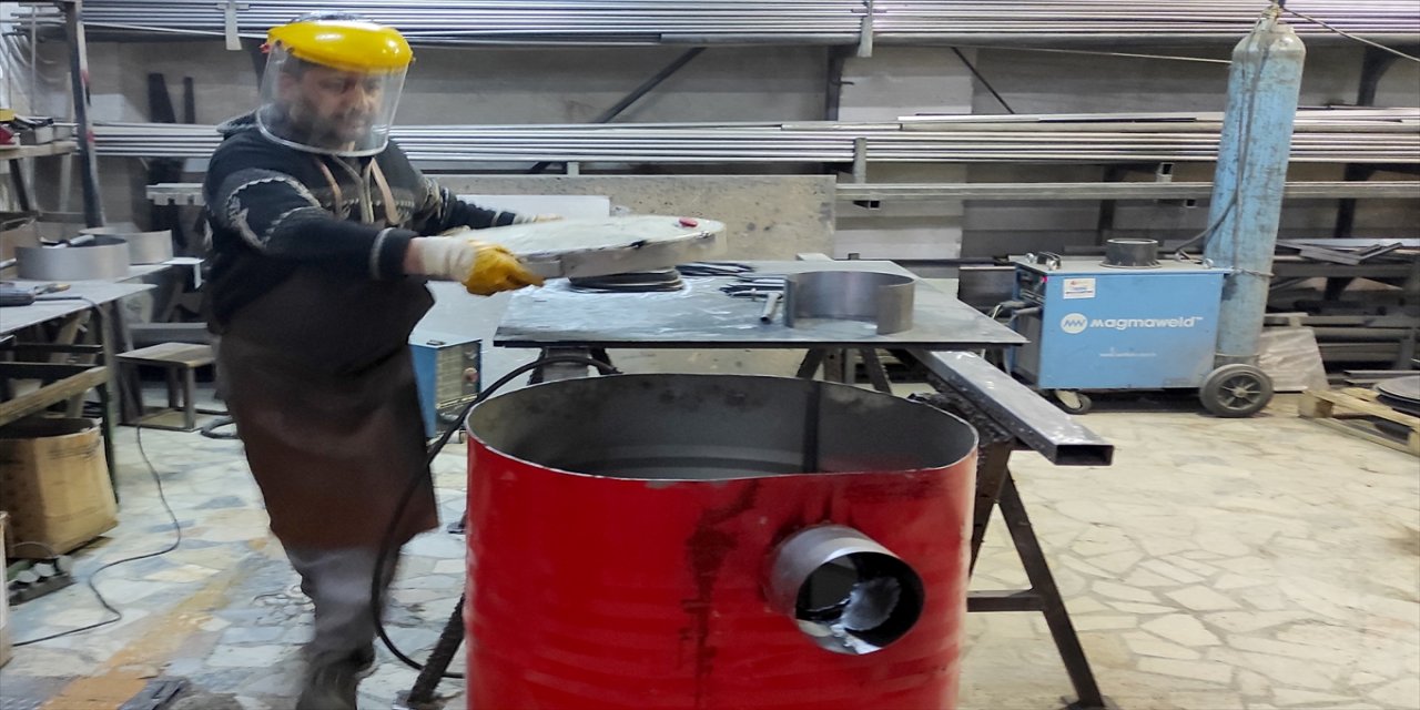 Baba-oğul depremzedeler için varillerden soba yapıyor.