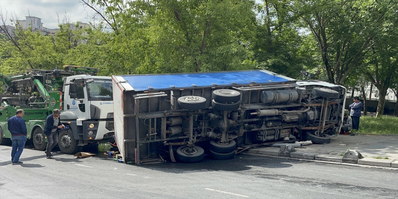 Bayrampaşa'da rampada kayan kamyon yan yattı.