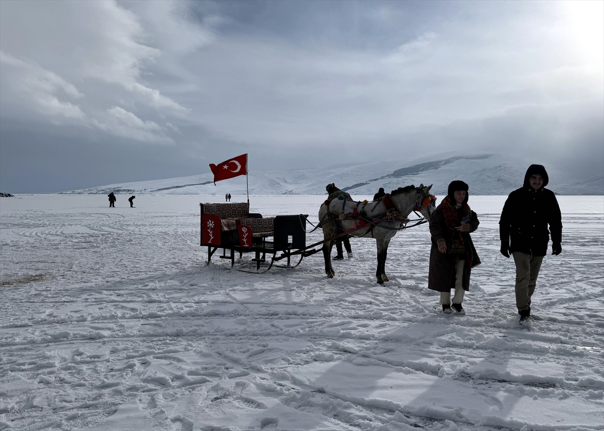 Yüzeyi donan Çıldır Gölü'nde ziyaretçiler atlı kızakla geziyor.