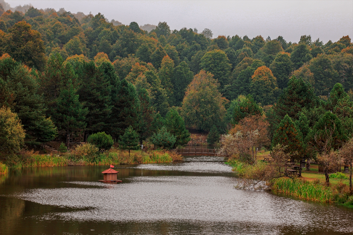 Yeşil ve sarı tonlara sahip kayın, meşe ve çam ağaçlarının oluşturduğu manzaralar dronla görüntülendi.