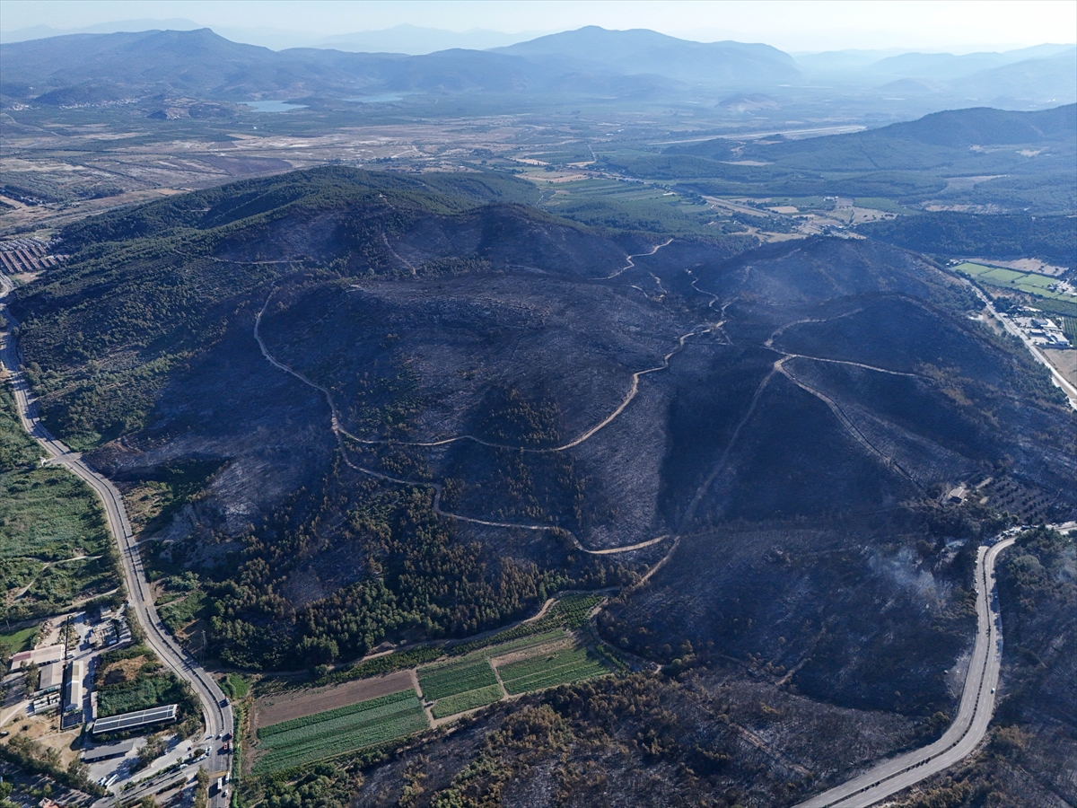İzmir Selçuk'ta yangında zarar gören ormanlık alan havadan görüntülendi