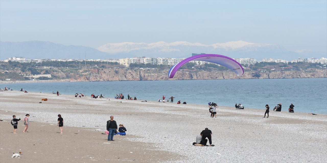 Konyaaltı Sahili'nde bazı vatandaşlar ile turistler denize girdi, kumsalda güneşlendi, çocuklar da aileleleriyle oynadı.