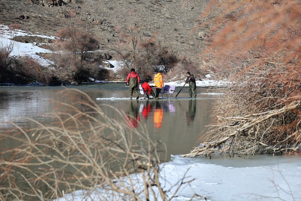 Merkeze bağlı Bayraktar köyünde avlanmak için nehir kenarına gelen amatör balıkçılar, yaklaşık 20 santimetre kalınlığındaki buz kütlesini kazmalarla kırarak üzerine çıktı.