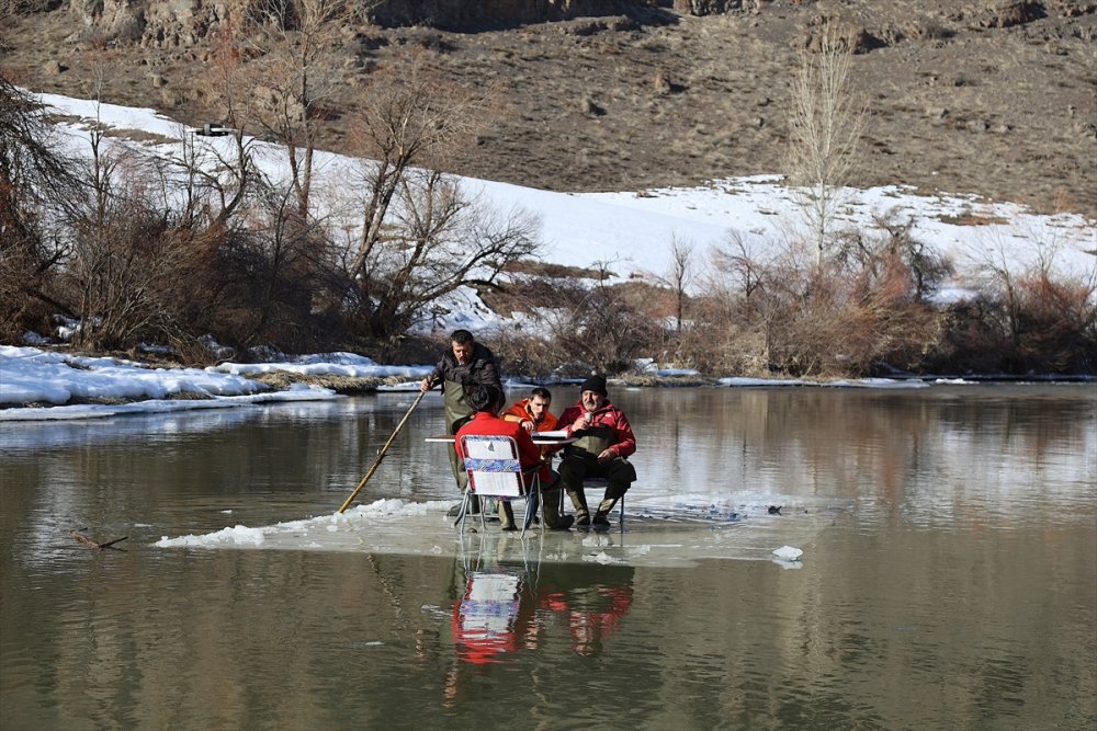 BAYBURT (AA) - Bayburt'ta kısmen donan Çoruh Nehri'nde buluşan amatör balıkçılar, sal amacıyla kullandıkları buz kütlesinin üzerinde yemek yiyip avlandı.