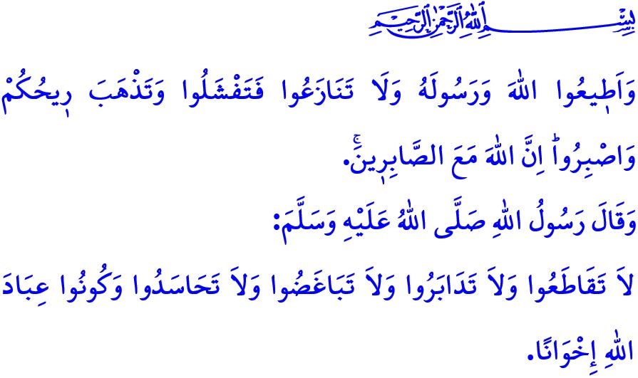 Hutbemi, Enfâl sûresinin 46. ayetinin mealiyle bitiriyorum: “Allah’a ve Resûlüne itaat edin ve birbirinizle çekişmeyin. Sonra gevşersiniz, gücünüz, devletiniz elden gider. Sabırlı olun. Allah sabredenlerle beraberdir.”(8)