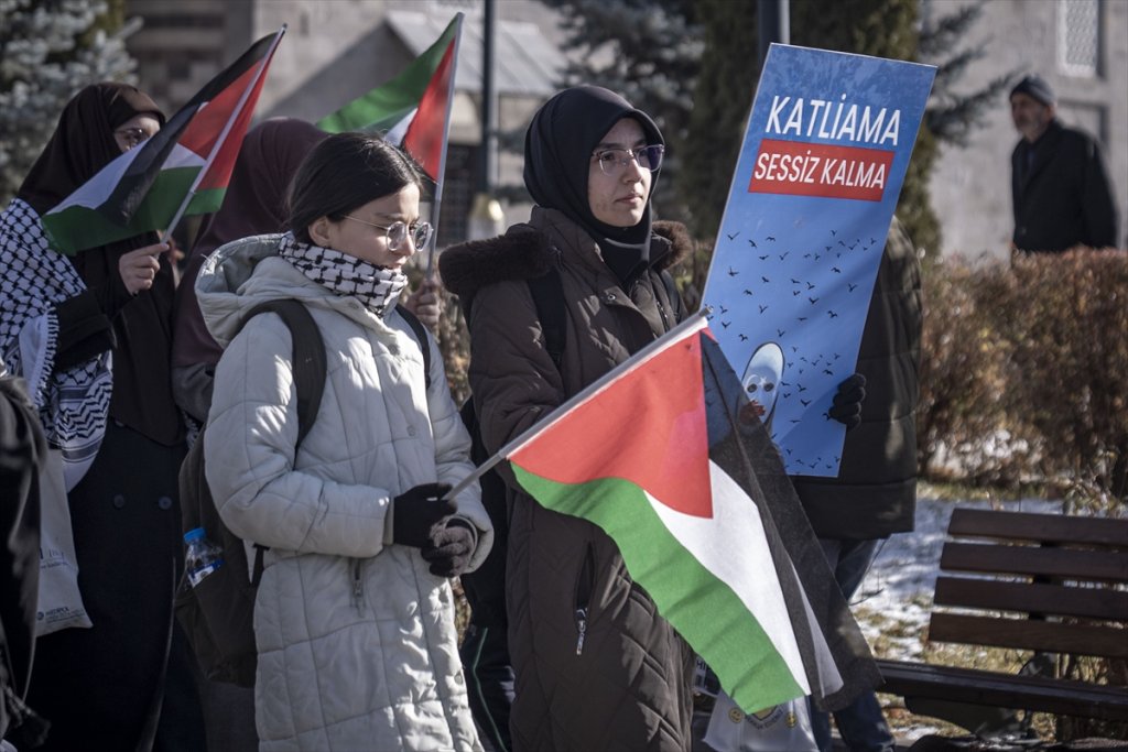 Lala Mustafa Paşa Camisi önünde bir araya gelen, aralarında doktorlar ve tıp fakültesi öğrencilerinin de bulunduğu sağlık çalışanları, Türk ve Filistin bayrakları eşliğinde taşıdıkları döviz ve pankartlarla Yakutiye Medresesi'ne kadar yürüdü.