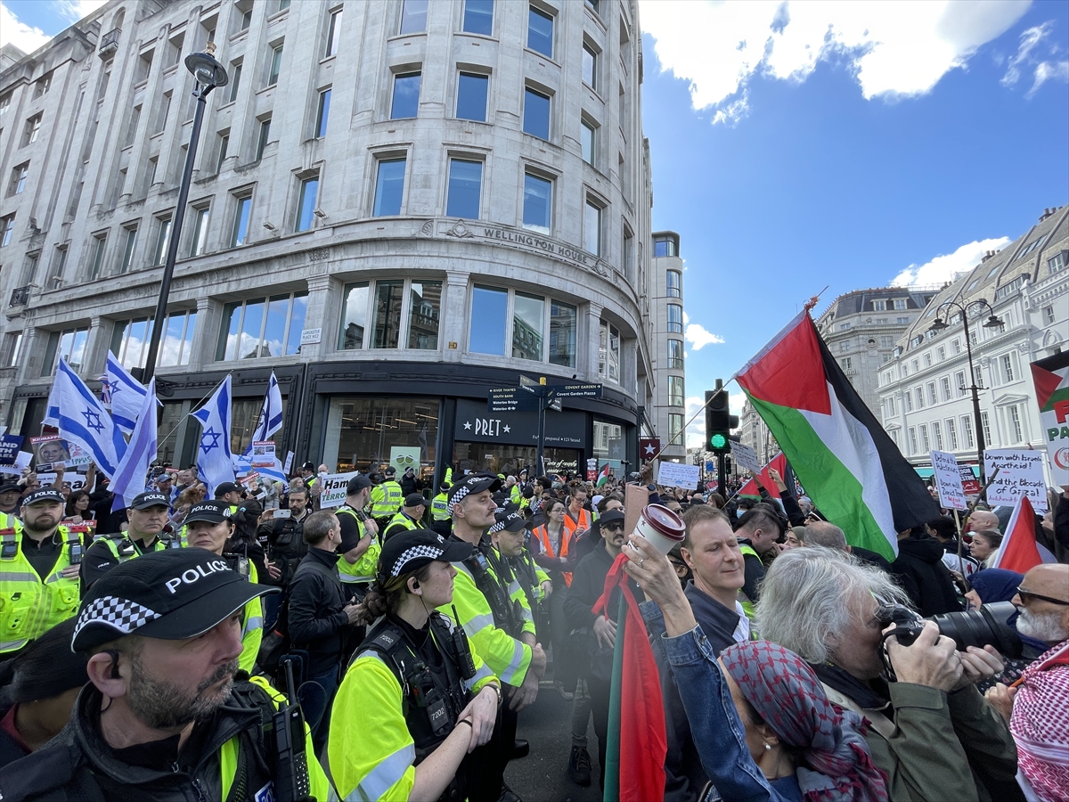 Öte yandan bir grup İsrail yanlısı da, Waterloo Köprüsü yakınlarında bayraklar ve pankartlarla karşı gösteri düzenledi. İngiliz polisi iki grubun karşı karşıya geldiği güzergah boyunca yoğun güvenlik önlemleri aldı.