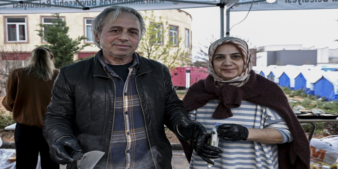 Eşi ve çocuklarıyla kente gelen Bataroğlu, Kahramanmaraş Sütçü İmam Üniversitesi Avşar Kampüsü'nde kurduğu çadırda depremzede çocuklar için 3 gün önce hamburger pişirmeye başladı.