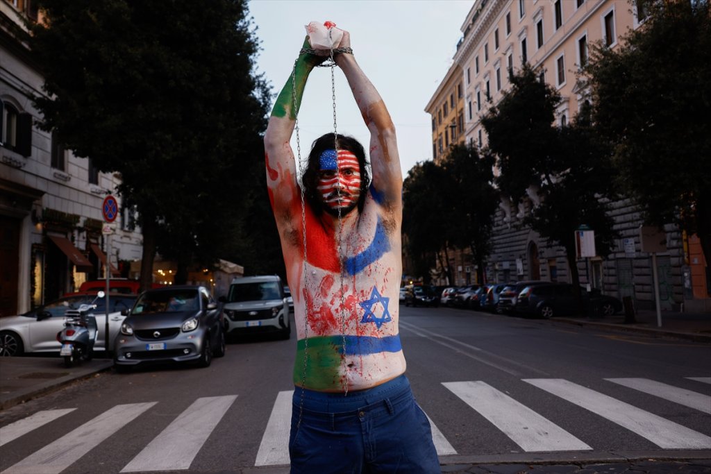 Bir göstericinin, yüzünü ve bedenini ABD, İsrail ve İtalya bayrağı şeklinde boyayıp üzerinde kanlı el izleri bulunması dikkati çekti.