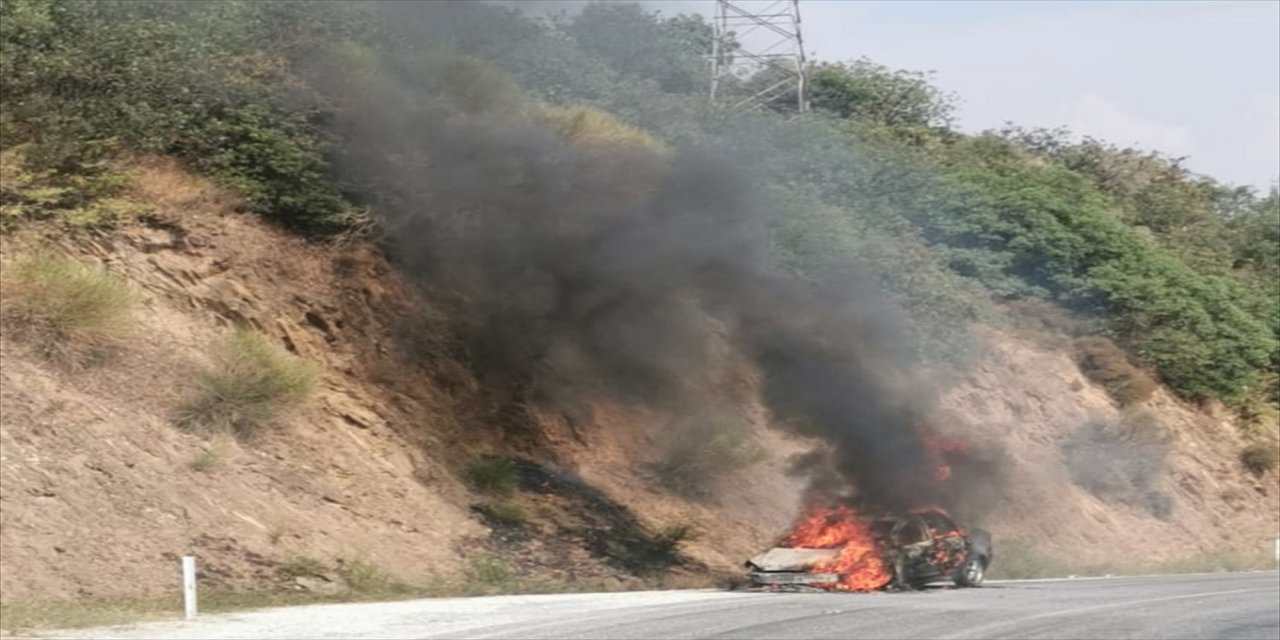 Aracından alevlerin yükseldiğini gören Bakıcı, otomobili yol kenarına çekti. Yangın, rüzgarın da etkisiyle makilik alana sıçradı.