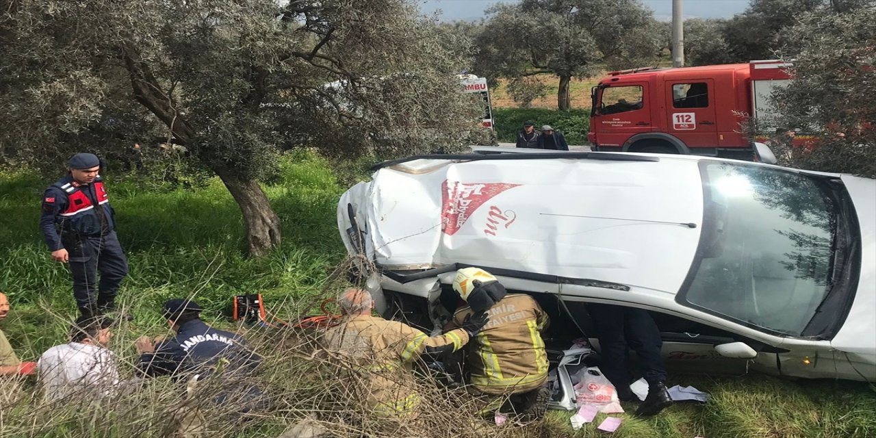 Çarpışmanın etkisiyle yol kenarındaki bahçeye savrulan hafif ticari araçtaki sürücü ile diyaliz hastası 5 kişi, sıkıştıkları yerden İzmir Büyükşehir Belediyesi AKS ekiplerince çıkarıldı.