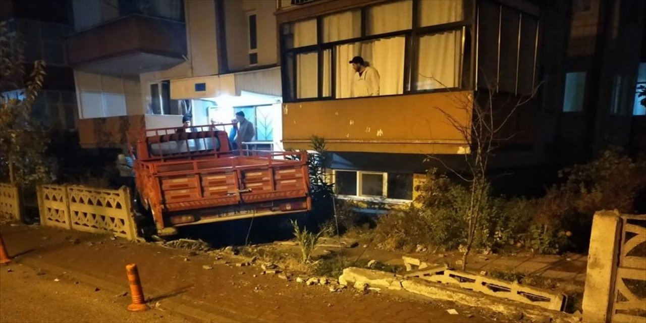 Hızını alamayarak duvarı yıkan kamyonet, site bahçesine girdikten sonra apartman merdivenlerine çarparak durabildi.
