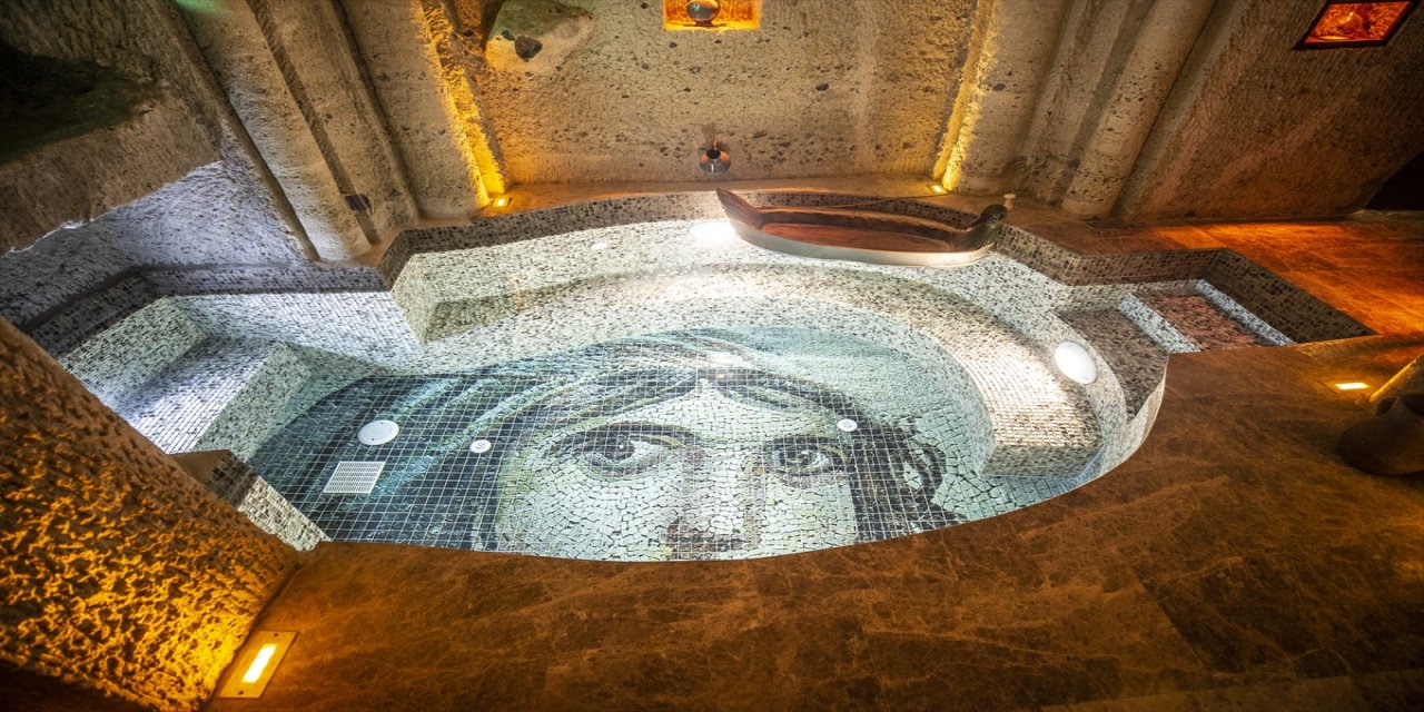 NEVŞEHİR (AA) - Nevşehirli bir girişimcinin tasarlayarak hayata geçirdiği kayadan oyma otelde, Prenses Diana, Şakira ve Madonna gibi ünlü isimlerin mozaiklerinin zeminleri süslediği havuzlar yer alıyor.
