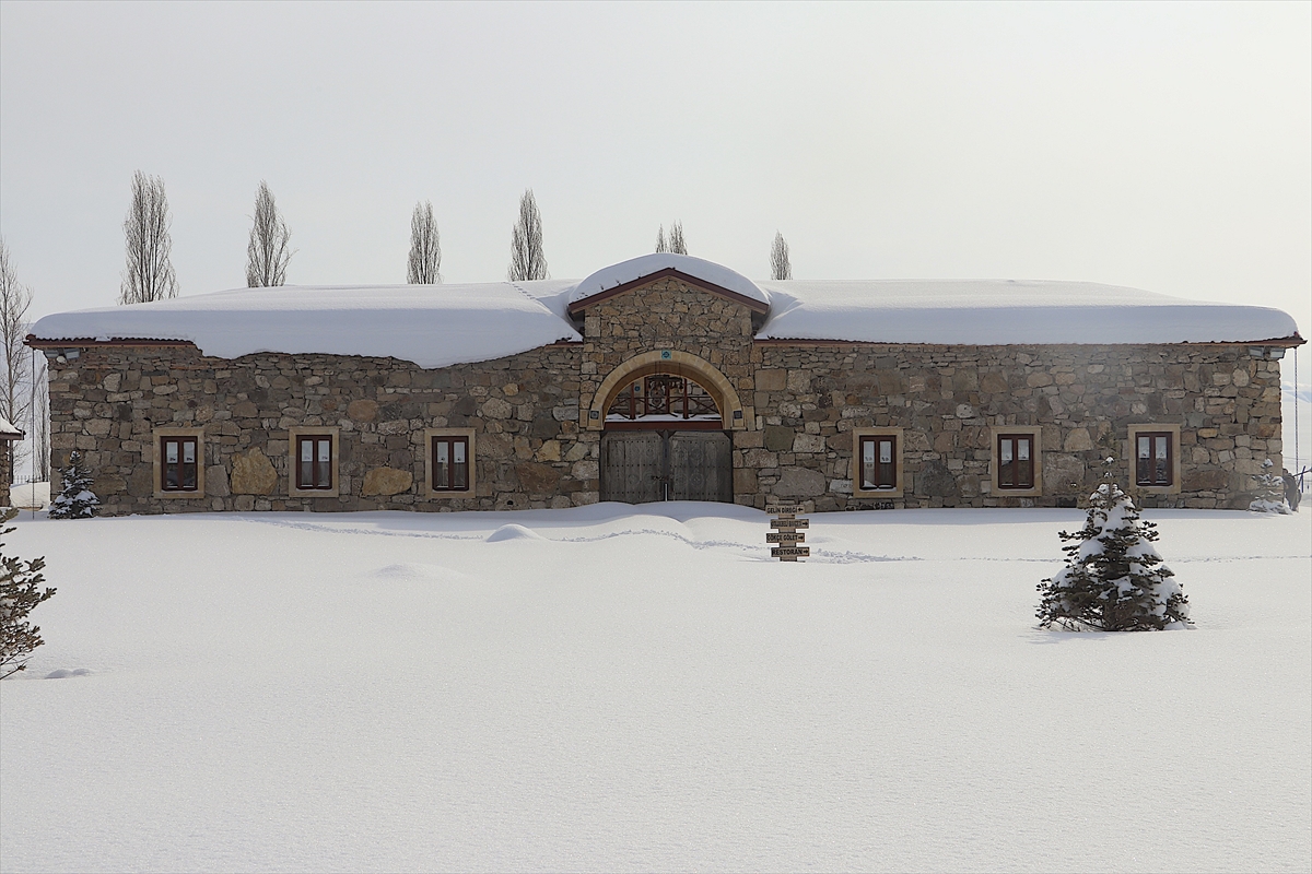 Envanterinde eski sosyal yaşamı anlatan araç gereçler, taş ve ahşabın buluştuğu mimari yapılarla Anadolu'nun güzelliklerini anlatan Beşpınar köyündeki Kenan Yavuz Etnografya Müzesi de yağış sonrası karla kaplandı.