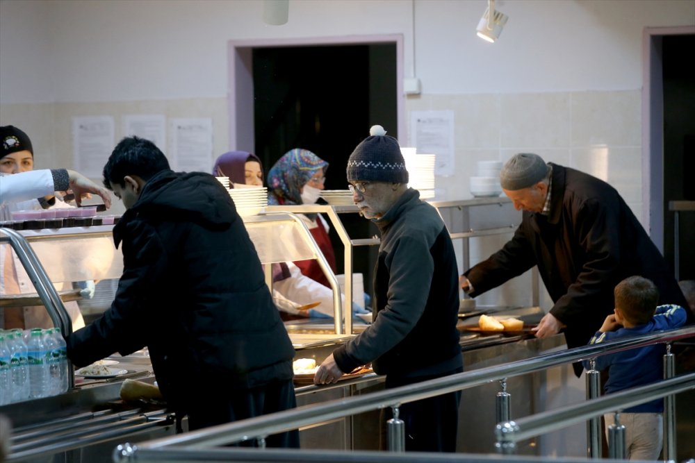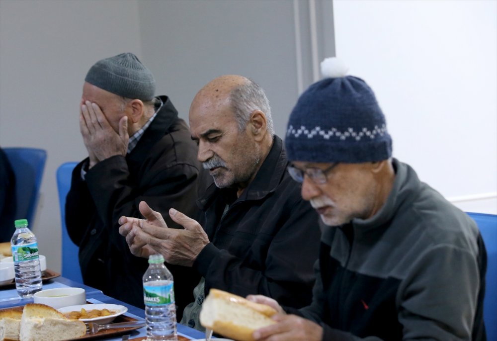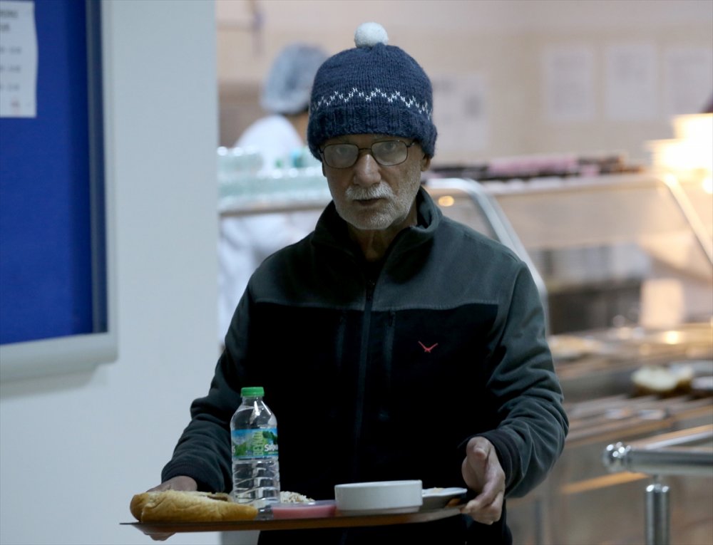 Kredi Yurtlar Kurumu (KYK) Şemseddin Sami Öğrenci Yurdu'na yerleşen depremzedeler, yemekhanede yemeklerini aldıktan sonra ezanın okunmasını bekledi.