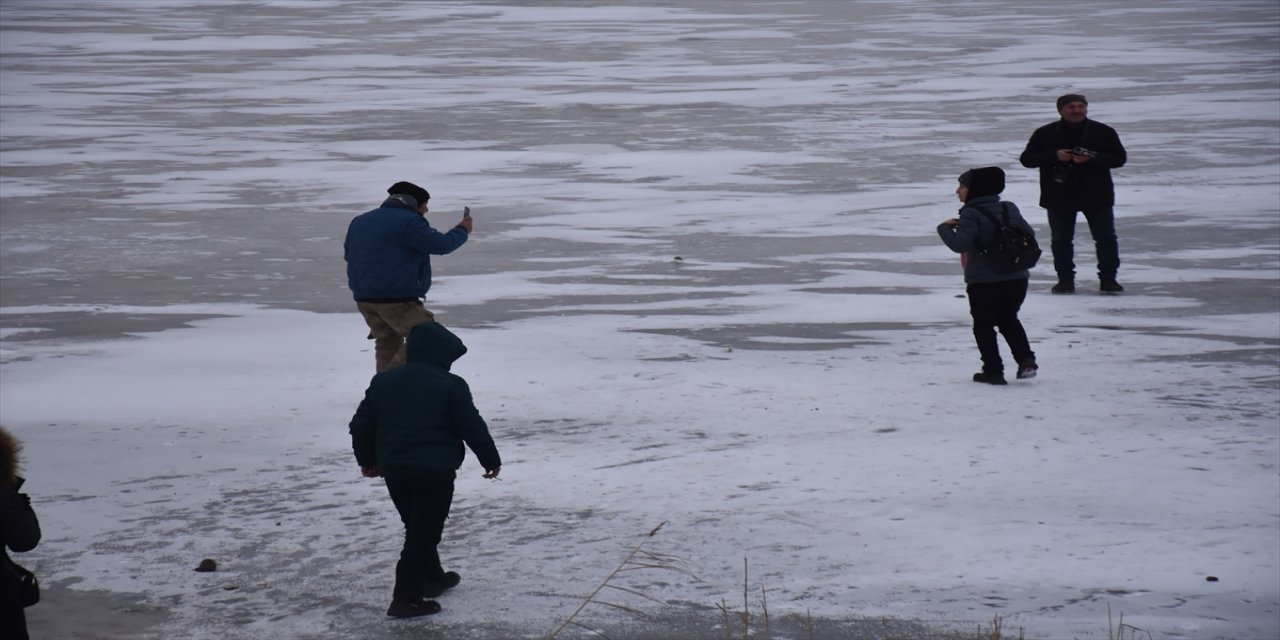 Kars'ın Arpaçay ilçesi Taşbaşı köyü mevkisinde kısmen donan gölde ziyaretçiler buz üzerinde yürümenin heyecanını yaşadı