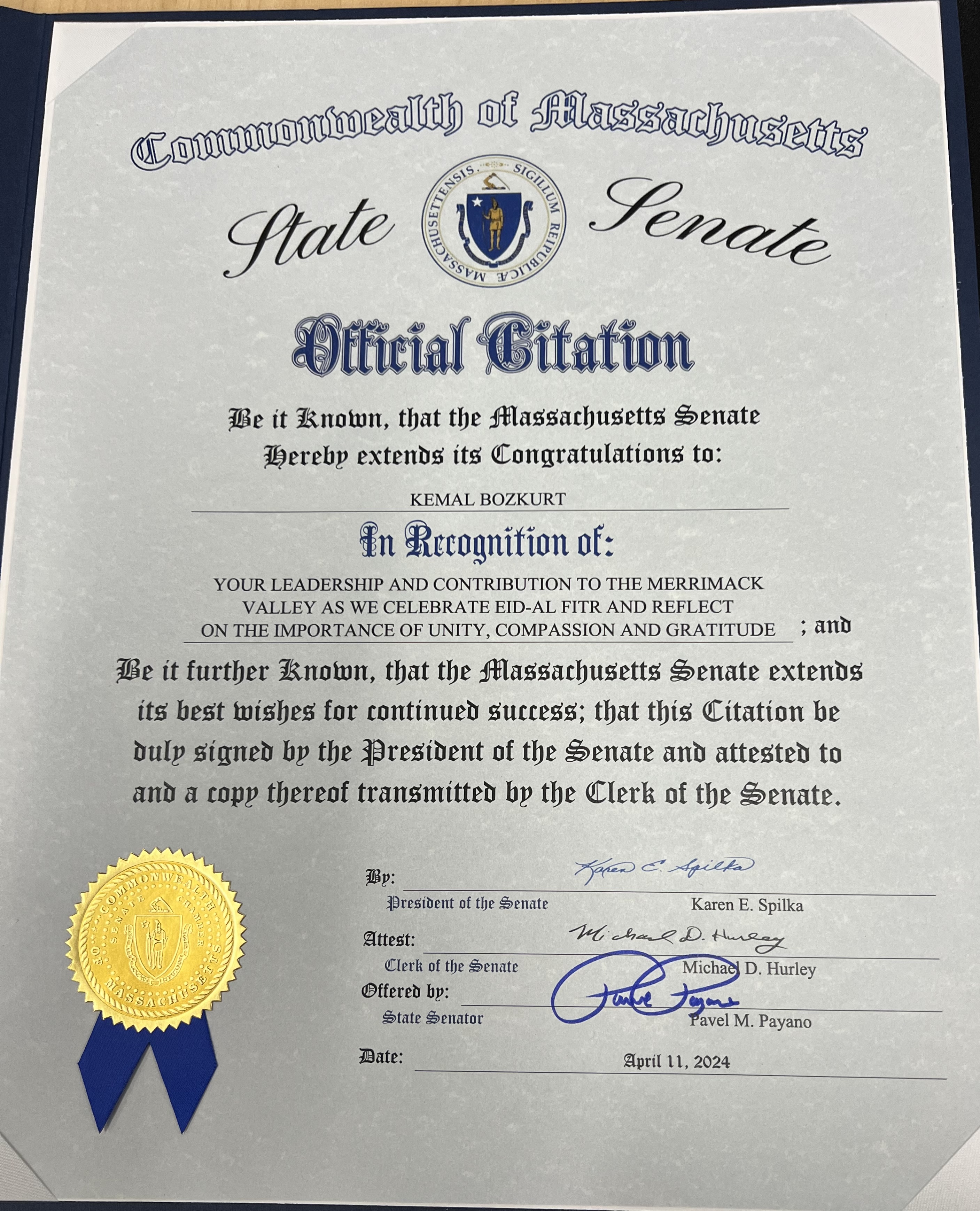 Massachusetts Valisi Maura Healey, Massachusetts’deki başarılı toplum liderlerinin bayramlarını tebrik ederek imzalı tanıtım belgesi ile ödüllendirdi.