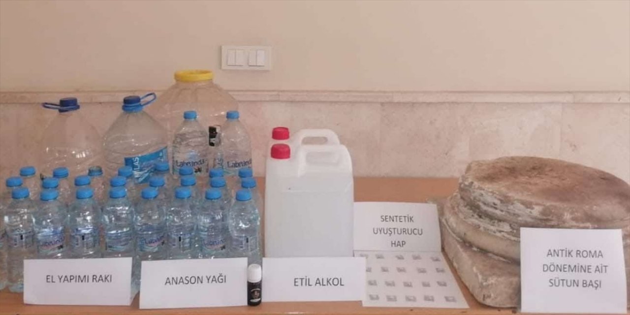 Hacı İlyas Mahallesi'nde O.K'ye ait eve düzenlenen operasyonda, Antik Roma Dönemi'ne ait sütun başı, bir miktar uyuşturucu hap, 40 litre el yapımı alkol ve anason yağı ele geçirildi.
