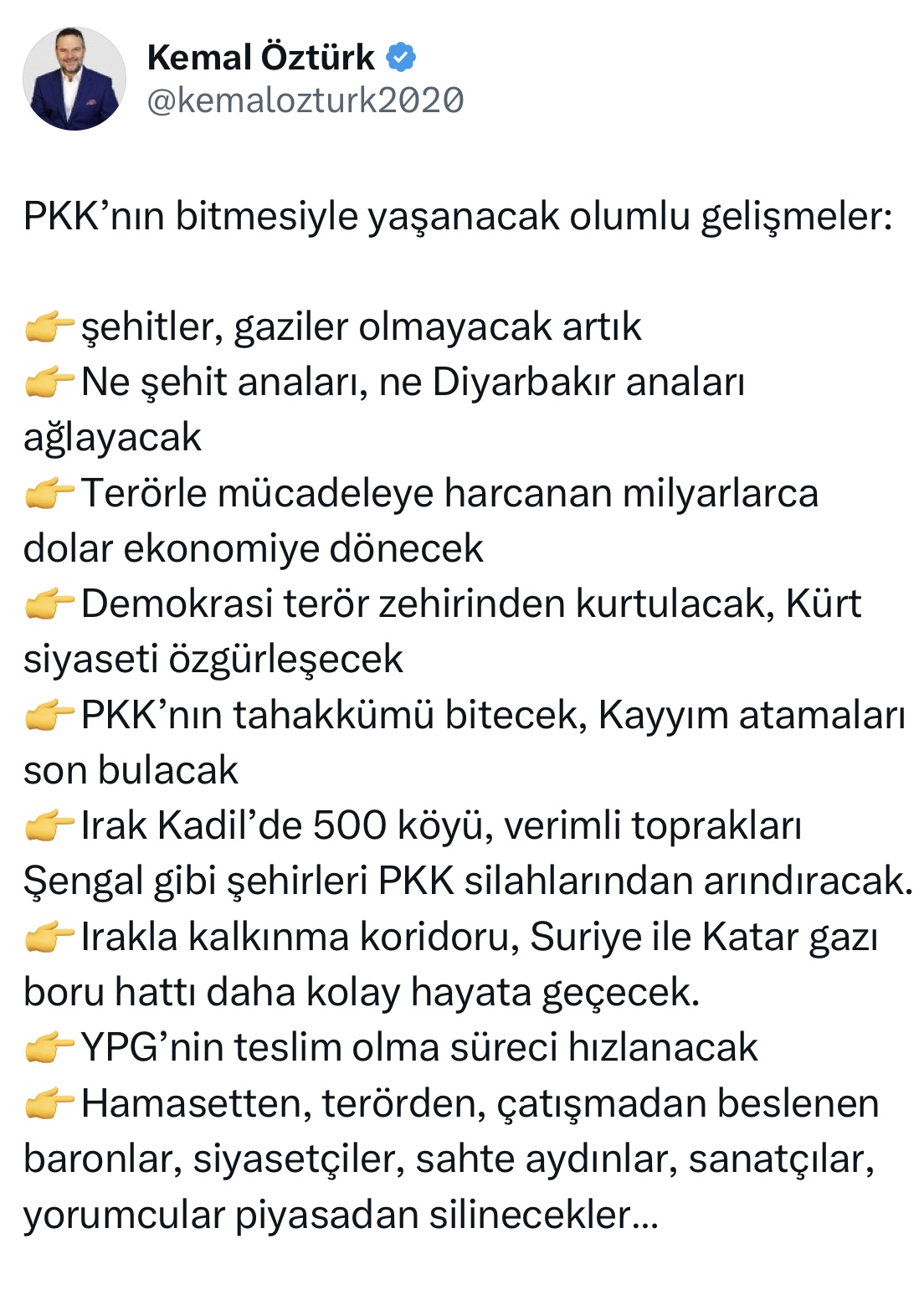 Eski AA Genel Müdürü, tecrübeli Gazeteci Kemal Öztürk PKK'nın silah bırakmasıyla yaşanacak olumlu gelişmeleri sosyal medya hesabından paylaştı.