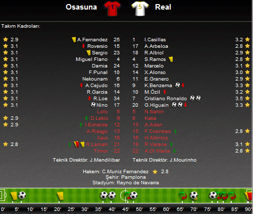 Lider Real Madrid, Osasuna deplasmanında farklı bir galibiyet alırken Cristiano Ronaldo ve Benzema'nın attığı müthiş goller maça damgasını vurdu. Madrid temsilcisinin gollerini Benzema, Ronaldo (2) ve Higuain (2) kaydederken Osasuna'nın tek golü Nino'dan geldi. Ayrıca 90. dakikada hakeme itirazdan sarı kart gören Lamah, tepkisini devam ettirince aynı dakika içerisinde ikinci sarı kartı görüp kırmızı kartla oyun dışında kaldı.
