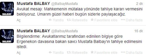 ''Avukatlarımız tarafından edinilen bilgiye göre Ergenekon davasına bakan savcı Mustafa Balbay'ın tahliye edilmesini istedi.Mahkemenin mütalaa yönünde tahliye kararı vermesini bekliyoruz. Umarım güzel haberi bugün sizlerle paylaşacağız.''