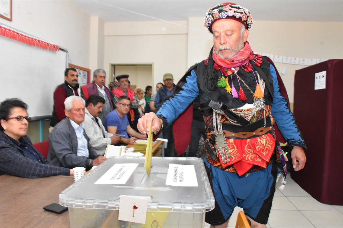 Aydın'da bir grup seçmen efe kıyafetiyle oy kullanmaya geldi.