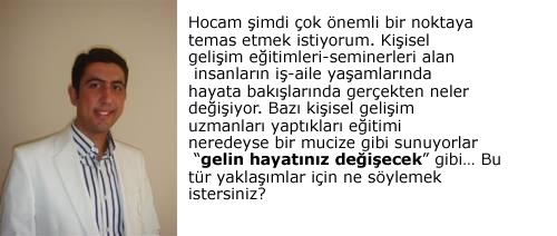 Gerçekten çok önemli bir noktaya temas ettiniz. Ben bu soruya cevap verirken kendi yaşamımdan örneklerle cevap vermek istiyorum. Üniversitede okuduğum yıllarda kitap okuma ve derslerde sunum yapma noktasında çeşitli sıkıntılar çekiyordum. İçimde çok fazla kitap okuma isteği olmuyor, sunum yaparken de çok fazla heyecanlanıyor ve arzu ettiğim şekilde kendimi ifade edemiyordum. Bu sıkıntılarımı aşmak üzere çeşitli kurslara katılmaya başladım. Kurslardan kendi adıma çok ama çok faydalandım. Gittiğim hızlı okuma kursunda okuma hızım yaklaşık 3 kat arttı, okuduklarımı çok daha iyi anlamaya başladım ve kitap okumaya olan ilgim arttı. Etkili konuşma kursu sayesinde sunumlardaki heyecanım azaldı ve kendimi çok daha rahat ifade etmeye başladım. Tabii bu kurslarda benimle birlikte birçok kişi de eğitim aldı. Ancak herkes farklı farklı noktalarda kazanımlar elde ettiler. Bir kısım katılımcılar kurstan daha az fayda elde ederken bir kısmı çok daha fazla yararlandılar. Ben eğitimlerin insan hayatında değişikliklere yol açabilmesi için öğrendikleri bilgileri hayata geçirmeleri gerektiğine inanıyorum. Kişisel gelişim kurslarında insanların hayatlarını olumlu yönde etkileyebilecek birçok bilgi paylaşılıyor. Ancak bir kısım katılımcılar bu bilgileri aldıktan sonra hayatlarında uygulamıyorlar. Bunun neticesinde de herhangi bir değişim olmuyor. Alınan bilgiler uygulamaya geçtiği anda değişim başlıyor. “Gelin hayatınız değişecek” gibi sloganları ben biraz pazarlamada etkileme amacıyla yapılan sloganlar olarak görüyorum. Biraz abartıldığını düşünüyorum. O yüzden kursu düzenleyen kurumları, eğitimcileri araştırdıktan sonra tercih yapmaları gerektiğini düşünüyorum. Ben de birçok kurumdan eğitim aldım. Bu kurslarda eğitimlere katılıp hayatı değişen birçok insan tanımakla birlikte herhangi bir değişime uğramadan kurstan çıkan insanlar da görüyorum. O yüzden bu kurslara katılan herkesin hayatının değiştiğini söylemek doğru olmayacaktır. Ancak bu kurslara katılıp öğrendikleri bilgileri hayatlarına geçirdikleri andan itibaren olumlu değişimler yaşadıkları da bir gerçektir.