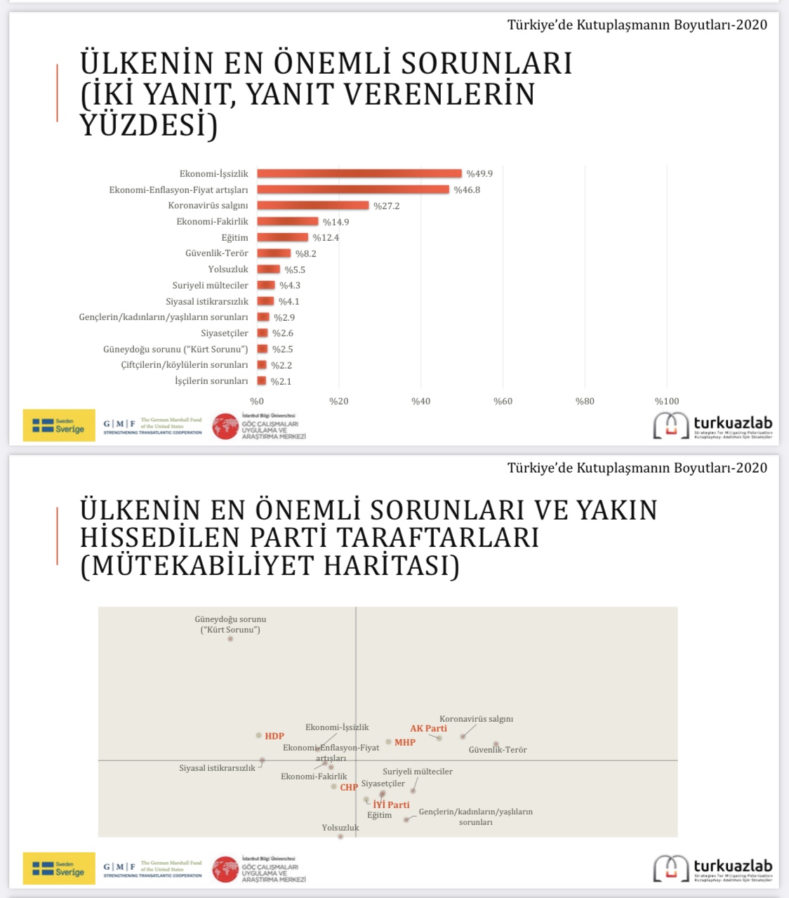 İşsizlik (%50), fiyat artışları (%47) ve Koronavirüs salgını (%27) ülkenin en önde gelen sorunları olarak görülüyor. Ancak farklı parti taraftarlarının bu konuda da görüşlerinde farklılaşma olduğu ortada.