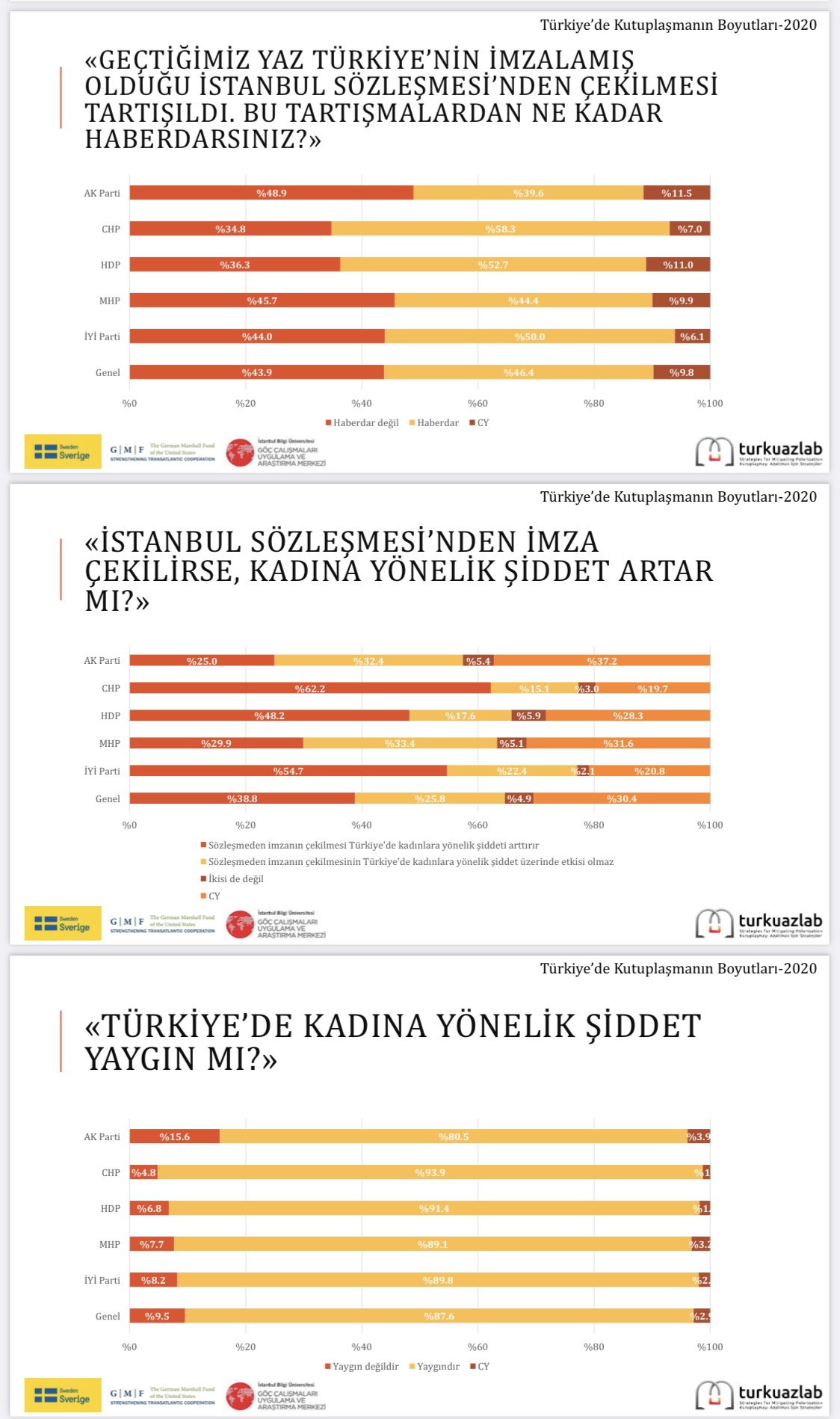 Görüşülen kişilerin yarısı geçtiğimiz yaz gündeme gelen İstanbul Sözleşmesi’yle ilgili tartışmalardan haberdar olmadığını söylüyor. Bu oran CHP taraflarında %35, AK Parti taraftarlarında %50 olmak üzere değişiyor.