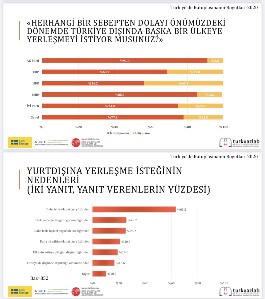 Araştırma çalışmasına katılanların %22’si önümüzdeki dönemde Türkiye dışında bir ülkeye taşınmak istediğini belirtiyor. Öte yandan bu oran HDP taraftarları arasında %44 ve CHP taraftarları arasında %31. AK Parti taraftarlarının %9’u ve MHP taraftarlarının %14’ü bu soruya olumlu yanıt vermişler. Ülkede iş olanaklarının sınırlı olması (%64), ülkede geleceğini görememek (%26) ve bireysel özgürlüklerin sınırlı olması (%26) görüşülen kişileri yurtdışında yerleşmeye iten faktörler arasında.