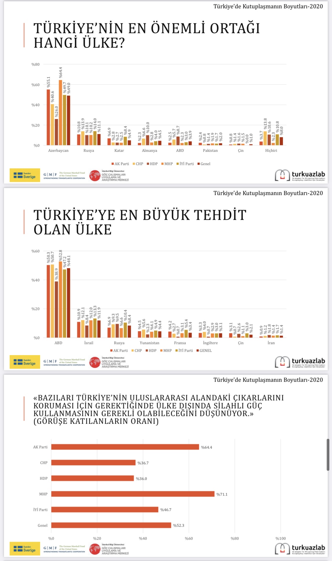 · Türkiye’nin en büyük dostu olarak Azerbaycan (%49) görülüyor, HDP haricinde bütün parti taraflarında bu yanıt %40’ın üzerinde verilmiş: MHP taraftarları arasında %64 ve AK Parti taraftarları arasında %55.