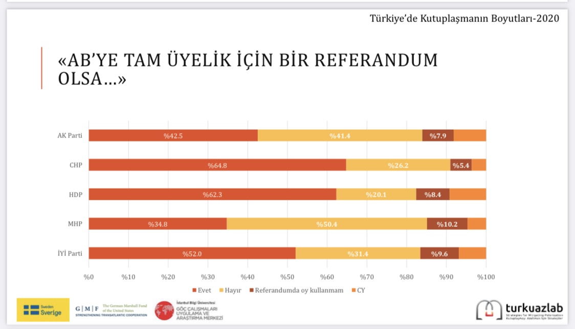Türkiye’nin Avrupa Birliği’ne (AB) tam üye olma konusunda yapılacak bir referandum için ise MHP taraftarları %50 oranında ve AK Parti taraftarları %42 oranında “hayır” diyeceklerini belirtirken, İYİ Parti taraftarları % 52; HDP’liler %62 ve CHP taraftarları %65 oranında “evet” yanıtı vereceklerini söylüyor. AK Parti taraftarları ve MHP taraftarları arasında “evet” diyeceklerin oranı ise sırasıyla %43 ve %35.