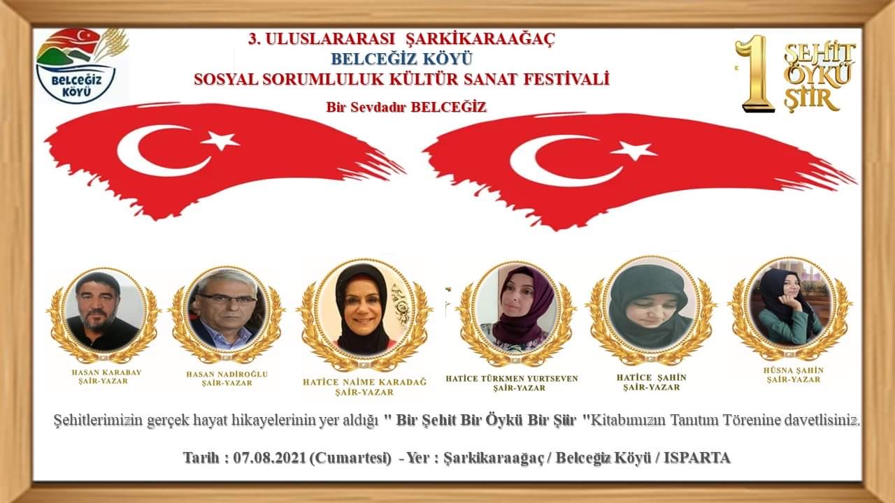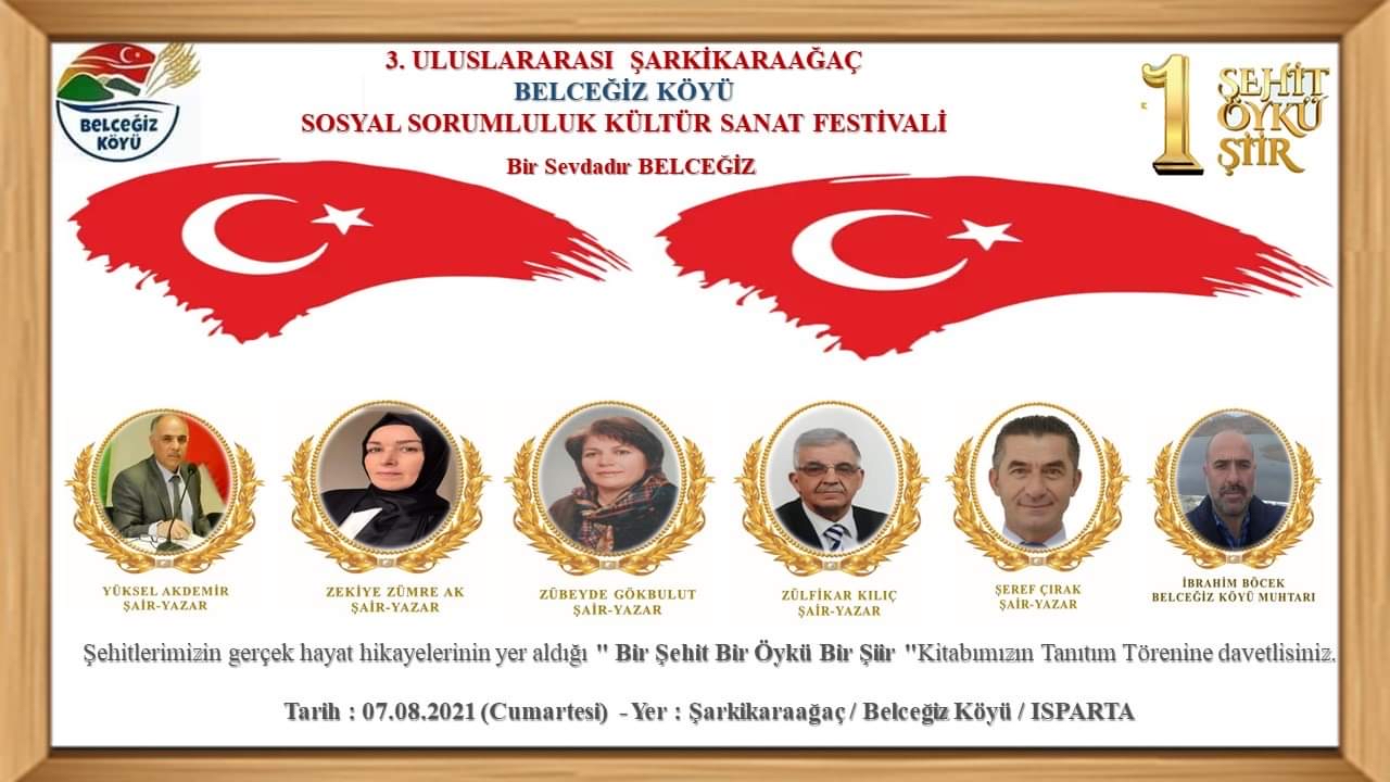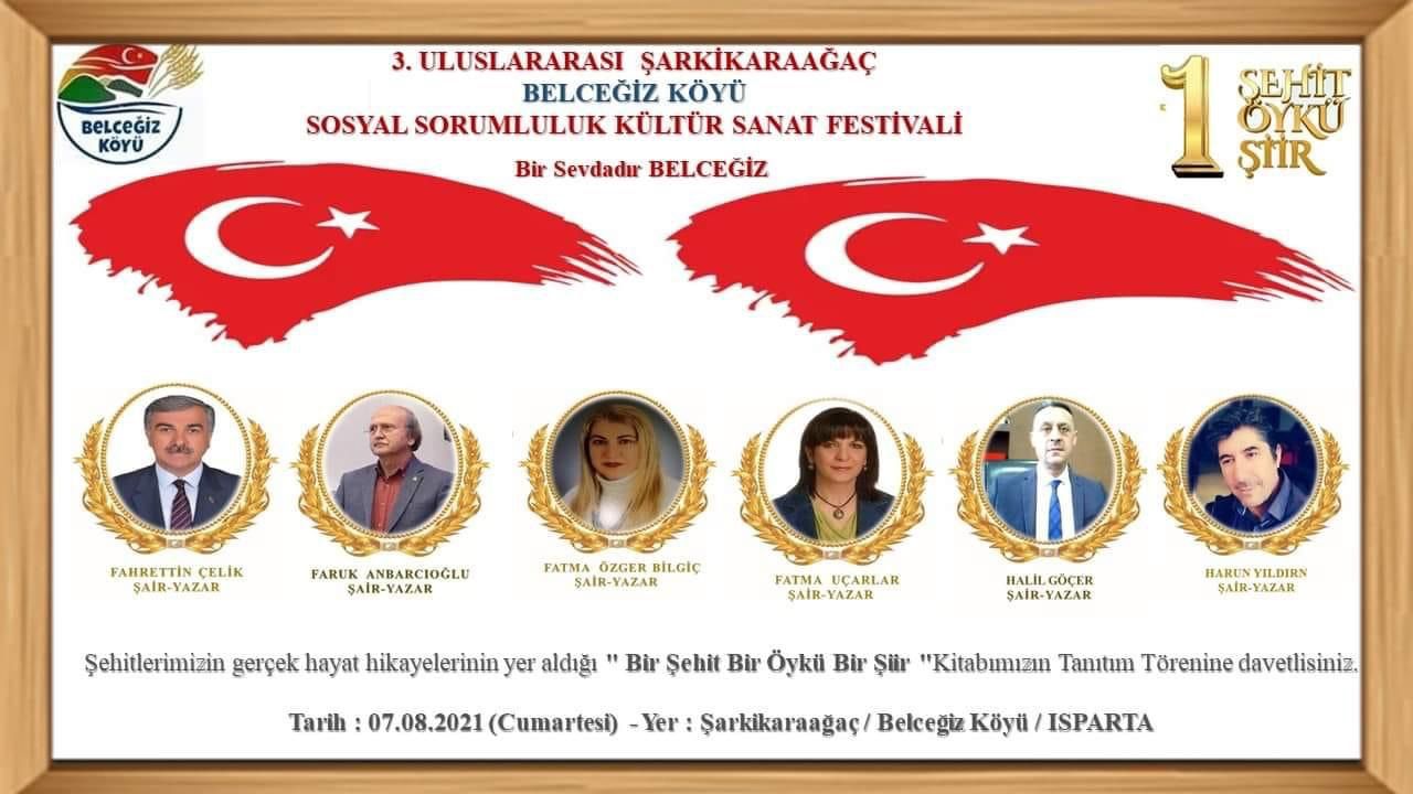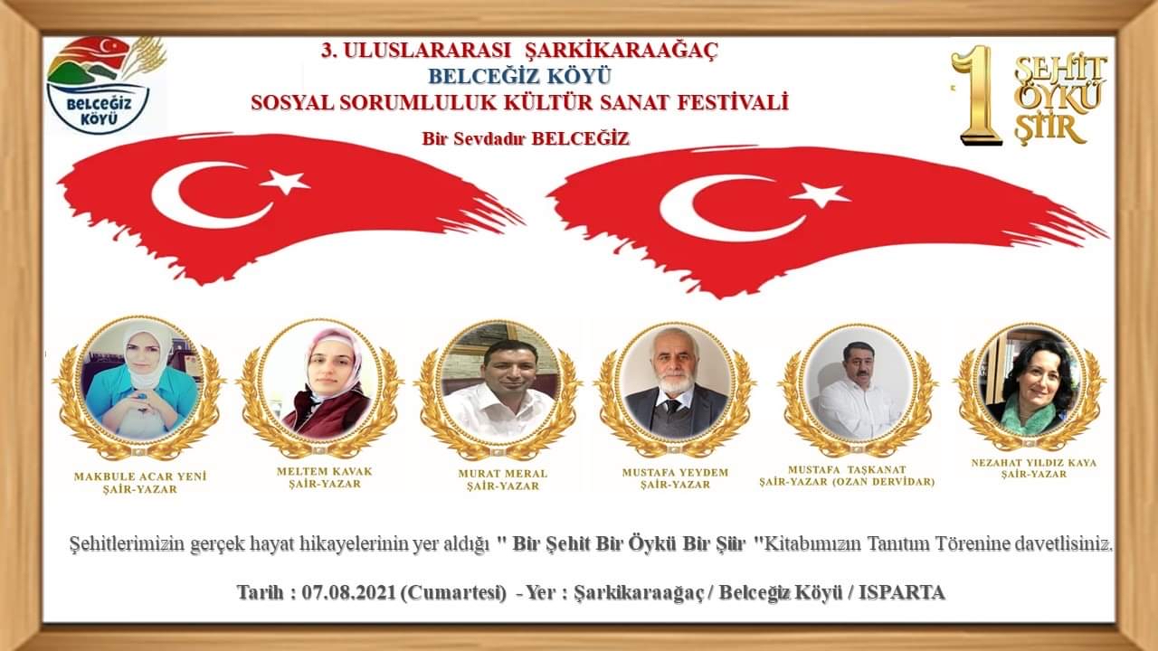 Eserimiz 3. Uluslararası Isparta Şarkikaraağaç Sosyal Sorumluluk Kültür Sanat festivali Belceğiz köyünde 07:08 2021 saat: 13 gerçekleşecek tören ile Türk halkına takdim edilecektir.